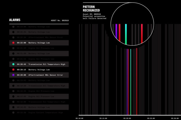 So, how does industrial AI solve this problem? Pattern recognition is a core functionality of industrial AI and can be organized by machine type, subsystem, and failure mode. For example, a library of known failure modes for diesel engines can be referenced and mapped to a signature of identified machine fault codes or alarms. Furthermore, because this pattern recognition is automated, it is consistently replicated across an entire fleet and an ever-expanding library of failure modes.
