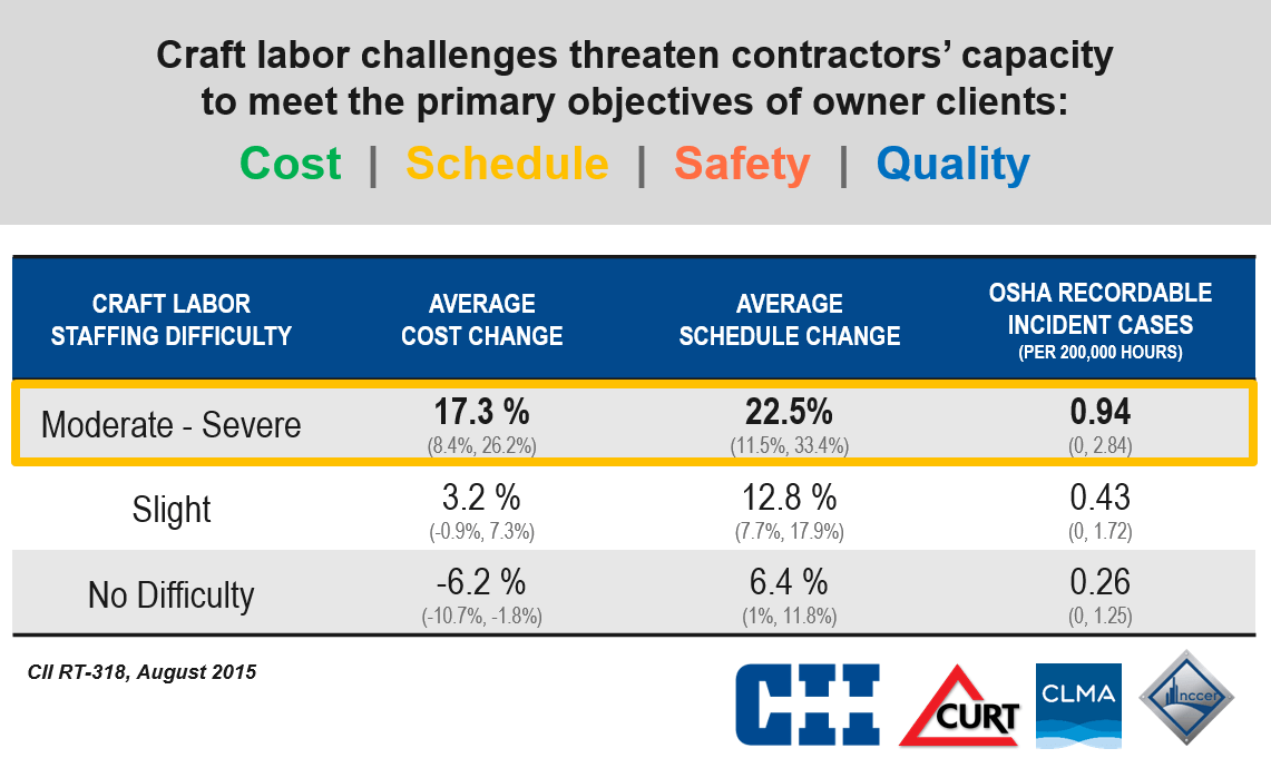 Skilled labor challenges threaten the ability to meet project objectives like safety, cost, schedule and quality. Recent research (RT-318) empirically demonstrated that labor shortages cause an increase in safety incidents, and other project objectives, directly proportional to the severity of the shortage experienced. Owners are in the unique position to lead, make workforce development a real priority, incent the right behavior and lessen/prevent avoidable project risk.